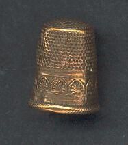 Brass thimble with rolled diagonally ribbed rim. Wide band of upright leaf patten. ÒAustriaÓ stamped in knurling which goes from band to and over top.