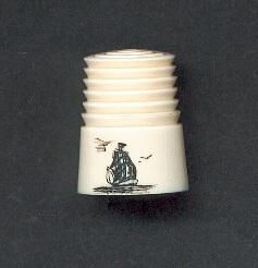 Hand crafted cream coloured thimble .Wide plain band at rim with scene of sailing ship ,water, clouds etched on. Instead of indentations there are six indented rows to the top and indented circles around top.Whale ivory .