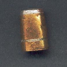 Hand made thimble of brass with steel top. Two lines near rim. Made from bullet.