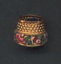 Brass, open-ended thimble (tailorÕs style). Band of cloth with petit-point design of flowers. Various red roses with green leaves, Made in Austria.