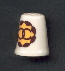 White ceramic thimble, glazed outside, unglazed inside. Brown and yellow logo of entwined C's in a circle.