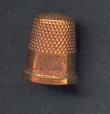 Large brass thimble with raised rim. Narrow band of pattern above rim. Wide plain band above then indentations to and over top. 12(size) stamped on plain band.