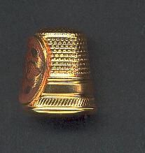 Gold plated brass thimble with hand enamelled cloisonneÕ shield. Shield has entwined CÕs as logo for Collectors Circle and Ô77 on it Enamelling is orange color with gold. 10(size) stamped on plain band above a diagonally lined band above a rolled rim.