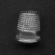 Small thimble with rolled rim. Narrow band of vertical lines above, then plain band. Knurling from there to and over top. %(size) stamped on plain band. No other marks.