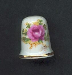 Porcelain, white, slightly fluted thimble. Gold narrow band at rim. Single large red rose with leaves on side. Decal. No marks.