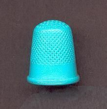 Blue colour, raised rim thimble Wide plain band. Diamond shaped kn urling to top. Round indentations on top. Inside apex ÒJapan 10 (size)Ó