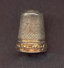 Silver thimble with gold band. Leaf scroll design on band. Stamped 800 (silver content) in indentations.Holes in top.Design of 8 pointed star on top.