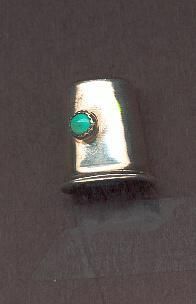 Silver thimble with rolled rim. Smooth from rim to top,round indentations on top. Small turquoise stone inset on side. Handcrafted. Stamped ÒSterlingÓ on back.