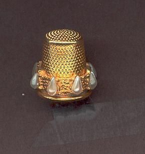 Gold coloured metal thimble with rolled edge.Band, narrow, of vertical lines above rim then an appled decorative band of 8 tear drop shaped white (pearl) stones. No Marks.