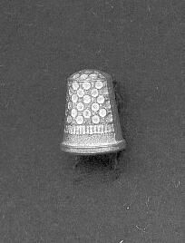 Small -1/2Óx1/4Ó gray metal thimble with rolled rtm. Plain band above rim with narrow vertically lined band above, then circular indentations to and over top.No marks.