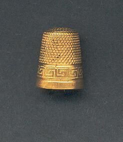 Brass thimble, no rim. Narrow plain band at base, wider band above with Greek Key , left, pattern. No marks. Knurling from design to and over top.