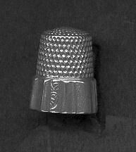 Silver thimble with wide band divided into convex and concave panels, wide and narrow. Wide ones plain, narrow ones with a leaf design. Knurling from band to and over top. Stamped in apex ÒSterling 10(size)Ó and trade mark of Webster Co., North Attleboro, Mass U.S.A.