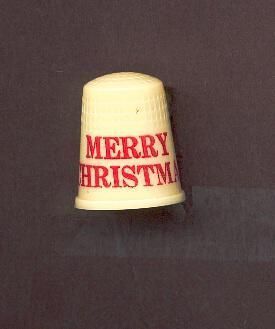 Cream coloured plastic thimble with ÒMerry Christmas Ò in red letters on wide plain band. Raised rim and square knurling above band to top, round indentations over top. U.S.A. 13 in apex.