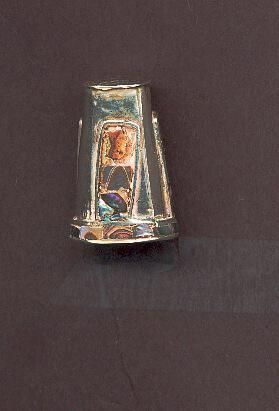 Tall silver, sterling quality, thimble with a raised rim with a narrow band of abalone around it. Three rectangular panels of abalone alternating with plain beaten silver between, around side of thimble. Side seam/ Added top with square indentations. Stamped inside 925 Mexico 2 and others I canÕt read.