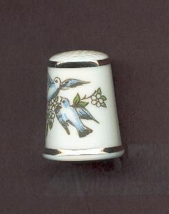 White bone china thimble with gold bands at top and rim. Two white doves on olive branch with white flowers one side. Other side small flowers and green l,eaves with ROYAL WORCESTER ENGLAND below. Decal. Top has faint indentations.