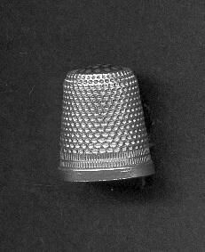 Nickel silver coloured thimble with magnet top. Raised rim and two narrow vertically ridged bands above rim. Indentations to top and over magnet.Stamped 10 Germany on rim. Stamped 17 in the vertical ridges.