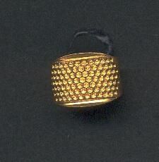 Gold coloured metal expandable ring thimble (Asian).Wide band with indentations narrowing each side and open at back to make it adjustable for size.No marks.