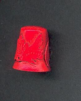 Red Faux Cinnabar with design of owl one side, feathers on other.