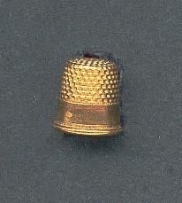 Small brass thimble with rolled rim. Wide plain band above rim, then knurling to and over top. No marks,