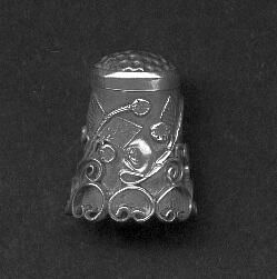 Tall heavy silver thimble. Side seamed with separate top. Added scroll design around rim and design of leaves and flowers above. Knurling over top Marked inside ÒMexico 925 LMC and another word not complete - CualaÓ