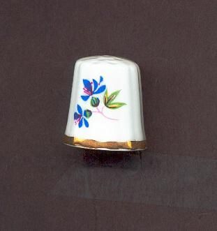 White china squat thimble with ridged exterior. Gold band at rim and flower spray each side. Blue and red flowers with green leaves,pink stems. Faint knurling over top. Stamped inside ÒCanadian Superior Fine Bone Chin a Made in Canada 1976-77.ÓDecal.