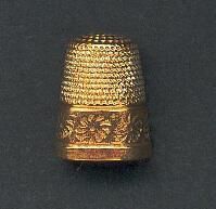Small brass thimble with plain band at rim. Wide band of chrysanthenum pattern separated by dots at top and bottom of band. No marks.