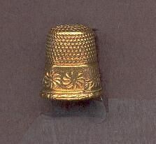 Brass thimble, small - either childÕs or maidenÕs, with patterned rolled rim. Wide band of daisy or chrysanthenum pattern above rim, then knurling to and over top. No marks other than size.