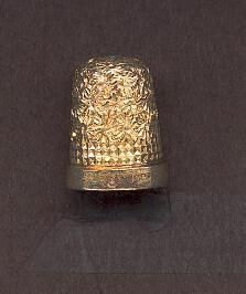 Sterling silver thimble with a gold wash. Plain raised band stamped 9 Birks Sterling . Three (3) rows of waffle pattern above band. Over-all Chrysanthenum patter from here to top and over.