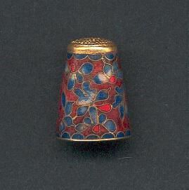 Tall thimble, cloisonne. Red bacground with blue flowers. Brass base, lined with blue enamel. No marks.Knurling only on the brass top.