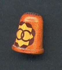 Mottled brown wooden thimble with raised rim.Indentations on top only. CollectorÕs Circle logo of entwined CÕs on side