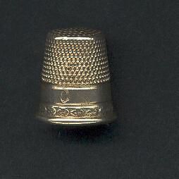 Nickel thimble with rolled rim and narrow band of pattern above rim. Pattern band is ribbed with small three leaf pattern around, Wider plain band above, then knurling to top and over. Size Ò0Ó stamped on plain band,No other marks