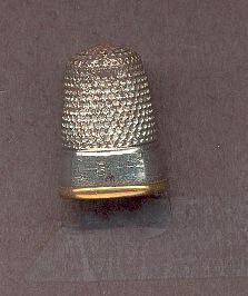 Steel or iron thimble with an added brass rim. Plain wide band above rim. % - size - stamped on band.