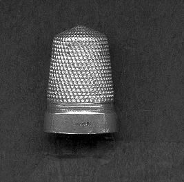 Tall silver thimble with wide band at lower edge.On band is stamped ÒsilverÓ and ÒInvictaÓ Narrower indented band above this then knurling to top and over. Inside lower part of thimble is a band of metal - steel? copper?. Seems to react to a magnet.