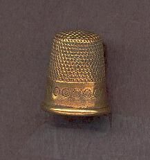 Brass thimble with rolled rim. Wide plain band above with row of double circles around near top of band. No marks.Knurling from band to and over top.