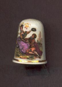 Whit china thimble, slightly fluted with fine gold line near base. Screen printed scene on each side - old fashioned girl in mauve dress on garden bench, hat in hand, boy sitting on ground beside her.Made in England stamped on inside.