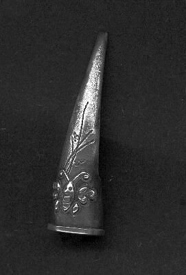 Silver Oriental finger guard with raised design. Design is mask with antennae. Length 2ÓNarrow raised rim.