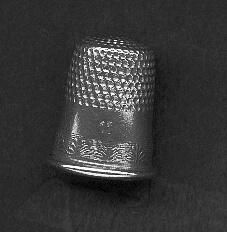 Metal thimble with rolled rim. Narrow band of palm leaf pattern at rim. Wider plain band above this with 11 stamped on it, th en knurling to top and over. No makers mark. DoesnÕt attract magnet.