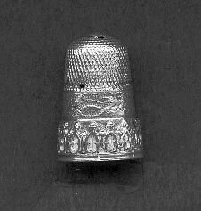 Tall silver thimble with wide band of raised pattern at rim. Above pattern is a wide band of zigzag pattern, then knurling to and over top. Holes - 3 - in knurling. No marks.Cable type thimble.