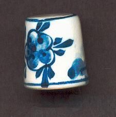 White pottery , delft type thimble with blue design. One side scene with birds, water, windmill. Other side flower and leaves all in blue. Circular rings on top instead of indentations. Marks inside thimble not too clear Backward E, W with line under, Forward E - 11 with line below plus three other symbols below..