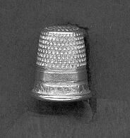 Silver col.oured childÕs thimble, probably nickel, with rolled rim. Narrow band of pattern - trefoil- above rim with a plain band above, then knurling to and over top. No Marks.