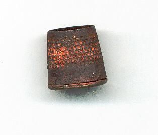 Steel, rusted, tailor's thimble lined with lead. Very heavy. Stamped 1(size) on band above rolled lead rim.