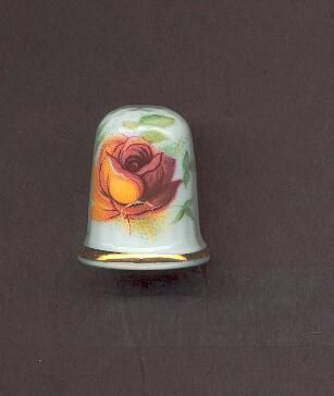 White china thimble, slightly fluted with gold band at rim. Screen printed design of yellow-red rose with green leaves. Inside of thimble unglazed. No marks.
