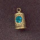 Brass charm thimble with attached ring. Slightly fluted with rim and narrow plain band above rim.Green coloured stone attached on side of thiomble. Diamond shaped knurling from plain band to top.