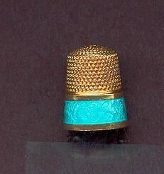 Sterling silver thimble with wide blue enamelled band at rim. Pattern on blue enamel of back to back CÕs and circles. Knurling from band to and over top. Gold wash over knurling and all over inside of thimble. Simon Bros. logo inside top with 8 (size) and Sterling Silver.