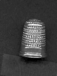 Sterling silver thimble with rolled facetted rim. Narrow plain band above rim with English hallmarks for maker CH (Charles Horner) size 9 and Chester 1903. From band to and over top are alternating rows of square and round knurling. This gives a wavy effect.
