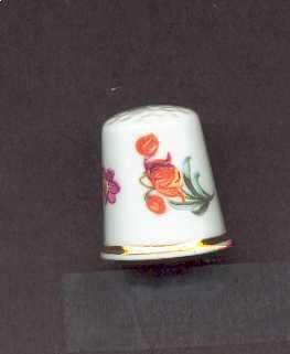White glazed bone china thimble with narrow gold band at rim. Three sprays of screen printed flowers with green leaves around thimble -one red,one orange and one blue. Stamped inside ÒOakley China, Fine Bone China, Made in EnglandÓ.