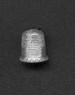 Silver thimble, squat shape. Rolled pattern rim with wide band above of birds and flowers. Called Flying BirdÓ. Stamped Sterling 8 and trademark of Goildsmith Stern Co.