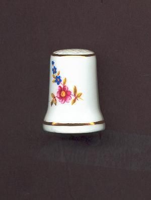 Bone china white slightly fluted thimble with a narrow gold band at rim. One side has decal floral spray of rose and blue flowers and leaves, other side has two small single flowers, one rosebud and one blue flower. Stamped inside Adderly with crown, the word Floral with a red flower and under that is Bone China Made in England.