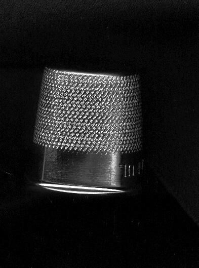 Nickel drinking measure with rolled rim. Plain band above rim with ÒJust A ThimblefulÓ stamped on. Diamond shaped knurling from band to top. Plain top with 1 1/2 oz. stamped on.