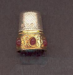Sterling silver thimble with band of 14 gold. Six oval red stones around gold band. Gold indented line above. Stamped ÒSterling Germany 6Ó in knurling. Knurling to and over top with a logo in center top. Logo maybe for LotthammerEber, Pforzheim, Germany.